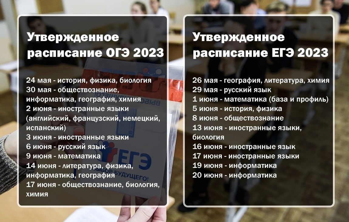 Приказом Минпросвещения России и Федеральной службы по надзору в сфере образования и науки от 16.11.2022 №989/1143 утверждено расписание государственной итоговой аттестации в 2023 году.Основной период ОГЭ пройдет с 24 мая по 1 июля 2023 года: